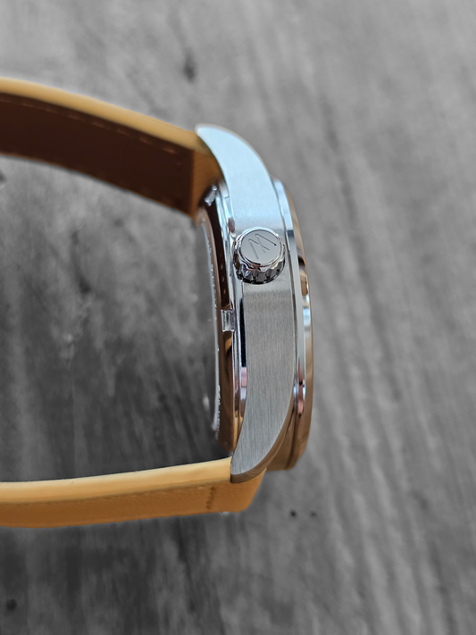 Refined and elegant, the MESHBERG 37 Automatic - Champagne Mist features a delicate champagne-hued dial with a subtle circular pattern. Crafted from 316L stainless steel and protected by scratch-resistant sapphire crystal, this 37mm timepiece is powered by the premium MIYOTA 9015 automatic movement. Water-resistant up to 5ATM, it’s a perfect blend of luxury and durability for any occasion.